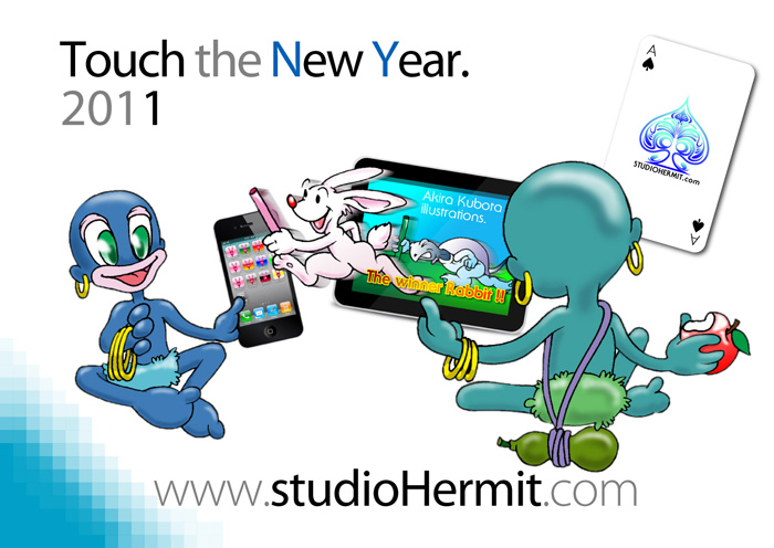 西暦2011年、年賀状イラストです。 2010年も終わり頃、iPod Touchを購入しました。 スマートフォン、電子書籍の流行を反映させたイラストとなりました。 書体(フォント)もアップルが使用するものを好んで使用しました。 詳細はオフィシャルブログにて配信中です。 イラストレーター、フォトショップによるイラスト年賀状作成を紹介しています。
