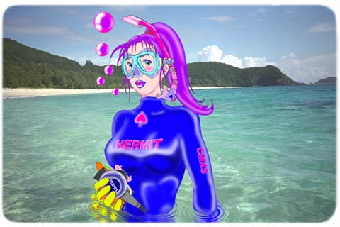 沖縄県の慶良間諸島の座間味島、古座間味ビーチで撮った写真と合成したイラストです。
