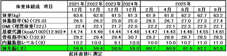なお、アンチエイジングのこれまでの実績把握として、目に見える数字で表現するために、体組成を2021年10月より測定している。