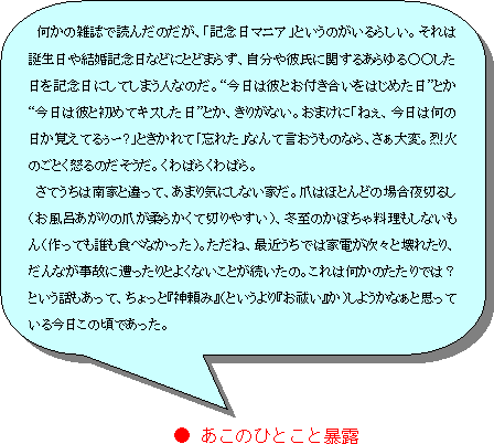 それはさておき、他の面でも色々と迷信を信じている霞家です。日常生活では「靴下を履いて寝ない」、「家の中では靴を履かない」、「北枕」、「夜、爪を切ると親の死に目に会えない」等があります。親だけでなく、長女にもしっかりと定着していてお互い気をつけて暮らしています。(次女・三女は新しい靴を買うとすぐに家の中でも履こうとしたりする)中でも「夜、爪を切る…」というのが結構大変で、朝の忙しい時間に爪切りをしなければならないだけでなく、整理の悪い霞家では爪切りを探すという余計な仕事まで加わってしまうからです。(爪切りに関して、夜はしないというのは三女にも定着している) また、子どもの誕生日、七草粥、節分、雛祭り、七夕、土用の丑の日、七五三、冬至、クリスマス等の年中行事も数多くこなしています。七五三は毎回岩手に帰って祝っている都合上、都合のよい週末になっていますが、他の行事はよほどの事がない限り、誕生日も含め当日に祝っています。平日であっても、ケーキやごちそうなどを準備しています…とは言うものの、既製のものに多く頼っていますが…。誕生日はケーキと当事者の好きなもの(子どもによってはピザだったり、寿司だったりする)、節分は豆まきと太巻き、雛祭りはケーキ・ちらし寿司・蛤の吸い物・桃の花、冬至はかぼちゃ料理(冷凍物のときもある)と柚湯(夫が会社の人からゲットした時に限る)等が定番となっています。もちろん、土用の丑の日は朝からウナギを食べています。(レンジでチンするだけなので、結構楽だったりする)それから、雛祭りと言えば、雛人形をいつまでも出して置くと結婚が遅くなるという言い伝えもあります。私の親が毎年さっさと雛人形を片づけていたおかげで、早々に結婚できたと未だに私は信じているので、何があろうと毎年3月4日に片づけています。 …と色々と書いてみましたが、すべての年中行事には対応できていません。中でも、結婚記念日は長女が生まれるまでは一応祝っていましたが、長女が生まれてからはすっかり忘れ去られています。何故なら、結婚記念日は3月4日、雛人形の片づけに追われているという悲しい現実だからです。 その他、何かにつけて、種々の縁起担ぎ、神頼みをしています。現在住んでいる家に引っ越しするときも荷物などは土曜日に運び込みましたが、人間だけは前日の金曜日・大安から新しい家で寝泊まりしました。そして、子どもたちのかばんには交通安全、身体安全などのお守りをつけています。さらに、私は昨年が厄年だったので、元旦の初詣のときに厄払いもしっかり済ませました。(出産が厄払いになるという説も知っていたのですが、さすがに実行には移せませんでした)妊娠中も安産の神様、水天宮に出向いてお守りと腹帯を買ってきて、戌の日につけました。2人目、3人目でパスして難産だったら目も当てられないので、家には3本の腹帯があります。おかげで3人とも、超安産でした。 こうして、霞家では各種の縁起を担いで暮らしています。「そんなの気にしない」という人も居るし、実際に迷信であることも多いかもしれません。それでも、腹帯の所にも書いたように「パスしてひどい目に遭ったら嫌だ。(子どもを育てながら働いているので)トラブルことなく日々平穏に生活したいので、担げるものは担いでおきたい。」「苦しいときの神頼み」ということが種々の縁起担ぎの一端を担っているのだと思います。朝の占いなども悪いなりに「口は災いの元」「遅刻に注意」などと1日のアドバイスになるようなことを聞くことにより、普段より更に注意して仕事や生活に立ち向かうことができるので(それでもドツボを踏むこともあるけれど)、それなりに意義深いのではないかと思っています。 子どもを育てながら働いていることで、日々の生活に追われている霞家ですが、こうして、家族揃って縁起を担いだり、節目節目を祝ったりすることで家族の絆を深める機会にもなるのではないかと思っています。みなさんも、たまには縁起担ぎをしてみてはいかがでしょう。新たな一面が見えてくるかもしれません。霞家も結婚記念日の祝いを復活させたいものです。