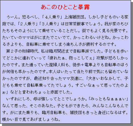 ご存じの通り、霞家では保育園に子どもを預けて働いています。保育園の場合は親の勤務に合わせて預けているので、親が送り迎えをしなければなりません。幼稚園の場合は幼稚園の時間に合わせて通っているので、自宅近くに来る送迎バスに乗せればよいのですが。たかが、送り迎えとはいえ、子どもが絡んでくるので、なかなか大人のペースではいかないものです。現在、次女と三女が職場の近くにある保育園に通っています。同じ区内とはいえ、自宅からは少し離れているので、子どもを連れて通勤することになります。 現在の自宅に引っ越しをする前は職場の近くに住んでいたので、当時は私が長女と次女を連れて保育園経由で通勤をしていました。引っ越しをした後も、自転車に2人の子どもを乗せて通勤をしていました。 ところが、半年余りが過ぎてから、三女を妊娠したことで事態が変わりました。それは、自転車に乗らなくなったからです。妊娠中も自転車に子どもを乗せて走っている人はいるのですが、私は用心のために自転車に乗るのをやめました。自転車を使わないとバスと徒歩で行くことになりますが、まもなく5歳の長女はまだしも、ようやく歩き出した1歳6ヶ月の次女を連れて歩くのは至難の業でした。最寄りのバス停まで大人の足で5分少々ですが、2人の子どもを連れては15分以上かかり、長い時には10分くらいバスを待ち、バスを降りてから保育園まで10分くらい歩き・・・と、自転車ならゆっくり走っても15分程度の道のりを40分以上かかるのです。通常でもハードであるのに体調不良の妊婦の身、朝は起きられないは、次女にだっこはせがまれるわ・・・でした。見るに見かねた車通勤の夫が朝はフレックスタイムを使って母娘を保育園まで送り届けることになりました。(一応、通り道だし、何と言っても原因の半分は夫にもあるわけですから。) 帰りは時間は気にせずにゆっくりと帰れば良かったのですが、真冬の寒くて暗い道を次女は歩きたがらず、仕事のやりくりがついてフレックスタイムの時間のつじつまが合うときには、帰りも夫に拾ってもらっていました。そうでない時はバス停でバスとタクシーを待っていて早く来た方で帰っていました。冬の間は寒かったこともあり、タクシーで帰った方が多かったような気がします。タクシーだと、ワンメーター+1〜2目盛りだったとは言え、ちょっとバブリーでした。会社から交通費としてバスの定期代(月9000円程度)が支給されていたので、大出費にはなりませんでしたが・・・。そして、ようやく産休に入り、暖かで明るい時間にゆっくりと送り迎えができるようになってからは徒歩とバスが復活、次女も2歳になり、歩くのも大丈夫になりました。 三女を出産後に復職した後は、半年余りの間は上の2人は保育園、三女は保育ママさんの所と、2カ所に預けることになりました。朝から一人で2カ所を回るのは厳しいので、私は保育ママさん、夫は保育園に連れて行くと分担することになりました。帰りは育児時間を取っていて4時半で仕事が終わる私が保育ママさんのところの三女を引き取ってから、上の二人を保育園から引き取るというパターンでした。 三女が4ヶ月くらいになってからは、おんぶができるようになったので、自転車が復活しました。(行きに保育園に連れて行く係は夫のまま)自転車で帰る時は、三女がおんぶされていて、長女は自転車の後ろの椅子、次女は前の椅子に乗っていて、1台の自転車に4人乗っているという状態です。子どもの汚れ物、ちょっと買い物などして、荷物が多いときもあります。この物凄い状態を「上海雑技団」と私と夫は呼んでいました。保育園から自宅に帰る途中、私の職場の人が最寄りの駅に向かう道を横切らなければらならず、うっかり、帰宅途中の職場の人に遭遇して「上海雑技団」状態を目撃されてしまうのは、余りにも怪しいので、信号待ちの時は交差点の角にあるローソンの物陰で待ち、極力遭遇しないようにしていたのでした。 そして、長女が小学校に入学と同時に三女は次女の保育園に入園し、預け先が1カ所になりました。しかし、朝、保育園に連れて行くのは夫の係のままで、私は自転車で職場に直行しています。以前は夫は7時過ぎには出発していたのですが、1年半近く朝の8時近くに家を出て保育園に寄っていくという生活を送っていたためか、一家揃って元のペースには戻れなくなってしまいました。夫が朝早く出たからと言って、帰りが早くなることもないので、改善されることなく、現在に至っています。また、私が会社に直行することにより、通常の勤務開始時間から15〜30分ほど早く仕事を始めることができます。以前にも書きましたが、私の職場もフレックスタイムを導入しているので、この15〜30分の細切れの時間の貯金も、子どもを病院に連れて行くとか、学校や学童の行事で早く帰りたい時などに大いに役立つのです。 帰りは私が自転車に2人を乗せて帰っています。2人