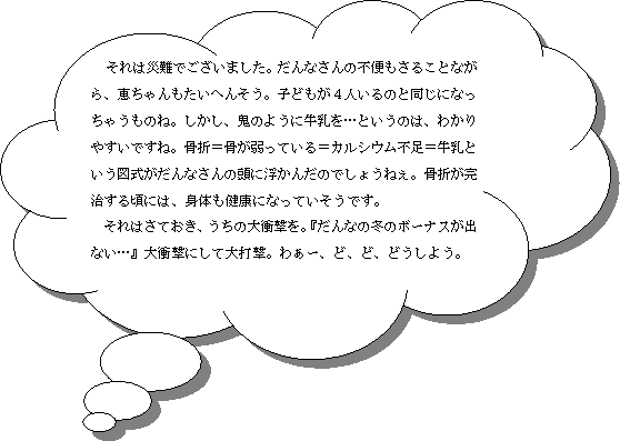 翌日も痛みと腫れが残っていたので、たまたま会社が休みだった夫は病院に行きました。昼前に携帯にメールが入り見てみると「骨折してた」という文字に大衝撃を受けたのでした。昼休みに電話を入れてみると、親指の第二関節の先の骨が欠けてしまったらしく、とりあえず、固定している状態でした。打ち所が悪かったと言えますが、2日後に保育園のソフトボール仲間も同じような怪我をしたので、そうとも言い切れないところがあります。 この想定外の事件により、霞家の生活リズムは一変してしまいました。親指を固定している状態なので、左手を通常通りに使えないため、夫の生活能力が大幅に低下してしまいました。更に着替えるのにも一苦労、子ども達の支度が終わっても、まだ着替え終わらず、箸も使えず、フォークで食事をするという、子ども達よりも「おこちゃま」な有様です。そんな夫を頼りにするのも気の毒なので、普段よりも多少は家事に励む私ですが、夫にしてみると歯がゆい状態らしく、不自由な手で手出ししてくる、いつもとさほど変わらない霞家の風景です。 それはさておき、一番変わったのは毎晩の晩酌が欠かせない夫が飲酒を取りやめていることです。毎晩、350ml缶を4本、油断すると6本くらいは飲んでしまうという夫ですが、背に腹は代えられないようです。(毎晩、これだけ飲まれるので、ここ1年以上はビールは却下され、単価の安い発泡酒に格下げです。どうせ、酔ってしまえばわからないみたいだし・・・。それでも、結構な酒代になるものです。)この飲酒取りやめというのが実は曲者です。今まではアルコール分さえあれば、簡単なつまみがあればOKだったのですが、アルコール分がないので、そういう訳にはいきません。子ども達はパンやコーンフレークの夕食でもOKなのですが、夫はそういう類は好まないので、ご飯を炊いてお茶漬けやら、焼きそば作ったりやらの夕食となるのでした。(晩ご飯が軽いことには変わりはないが・・・) 更にアルコールが入ると、眠くなる夫なのですが、この飲酒取りやめにより、眠気が起こりにくくなり、夜更かしに拍車がかかっています。テレビっ子の夫なので、テレビを見ているのはもちろんのこと、ゲームボーイにもはまり、「奥が深い」等、言いながら一喜一憂しているのでした。おかげで、その分、朝起きるのが遅くなるのに、支度が素早くできないという、ドツボにはまっているのでした。 また、夫はアルコールの代わりに「カルシウムを取らなければ」と、鬼のように牛乳を飲み始めました。ここの所、寒くなってきたので、1週間に1〜2リットル程度の消費だった牛乳が、6本も消費されてしまいました。アルコールに比べれば安いものですが、想定外の出費です。 こうして、迂闊な怪我によって、大衝撃を受けた霞家でした。怪我から約1週間が経過し、骨は付きつつあり、快方に向かっているので、一安心です。今年は春には私も怪我をしたので、来年は怪我のないよう、過ごしたいと思います。 それでは、また。