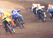 「ダートラ」という言葉を聞いた事があるだろうか?正しくは、ダート・トラックと言って、平らにならした土の楕円のコース(学校の陸上の400mトラックのイメージ)の上を前ブレーキの無いバイク(!)で走るアメリカ生まれの競技だ。何故前ブレーキが無いのかというと、ダート上で前ブレーキを掛けると転んでしまう。転んでしまうと危ないから前ブレーキが付いていないのである。この論理は、理解できないと思うが...。ダートラの走り方というのは、自動車ラリーで後輪をわざとスライドさせてコーナに進入していく様子をTVで見た事があると思うが、あれと同じ事をバイクで行うのである。僕自身、写真では見た事があるが実際に走っているのを見た事もないし当然走った事もない。そこで、7月10日に桶川のモトクロスコースの近くにあるダートラコースで体験走行ができるという話を聞いたので、参加することにした。この走行会は「ストリート・バイカーズ」誌上で募集している「ダート・トラック・パーティー」というイベントで、参加料は3000円程度で初めてダートラをするには好都合のイベントだ。実は「ストリート・バイカーズ」誌は大先輩の安田さんが編集しているので、「とても楽しい」という話は聞いていた。この事を後輩井出君に話すと彼も二つ返事で参加することになった。当日、桶川のダートラ・コースに着くと恐怖でドキドキ状態になってしまった。このコースは一周が100m程度のかなり小さいコースであるが、皆すごい勢いで走っている。安田さんを見つけて挨拶をするが、とても走る気にはなれない。ビビッてコース脇で見ていると、安田さんは走りながら「走れよ!」のジェスチャーをしている。その上、ナナハンでダートラする人まで出てきて(当然転んだ...)、過激さは増すばかり。モトクロスの経験もあってダートには僕よりも慣れているはずの井出君もすっかりビビッてしまっている。そんな状態のまま2時間が経過してしまった。