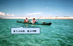 ![]() 第10回 臼井光昭 頭の上を大形旅客機が通過していく。港から少し離れると那覇空港に着陸する飛行機が次から次に通り過ぎていった。真下から見える旅客機の腹は丸みを帯び銀色に輝いていた。それが直ぐ上を爆音を轟かせて通り過ぎる。青空を一瞬銀色の機体が覆い、見とれている我々を置き去りにしていった。 照り付ける太陽は容赦なく我々に光りのシャワーを浴びせている。真っ青な海に腰掛けてパドルを回し、横に見える沖縄本島を遠くに眺めた。波に揺られながら周りを見たり、腰の周りの海面を期待を持って眺める。深い青色の海面は何処迄も透明で終りがない。その中から何かが出てきそうな不安と期待が交錯する。他の船は先の方を進んでいく。平野と伊藤さんの船も先頭の方に居るようだ。船と船の間はかなり離れ波間を漂う枯れ葉の様に見え、大きめの波が間に入るとその中に消えてしまう。流れがどの位あるのか分からないが、パドルを動かしていれば前には進んでいるはずだ。影のように黒く見える沖縄本島は相変わらず同じ姿を横たえ、全く変化がない。光りのシャワーは益々勢いを増し、長袖Tシャツを通して日に焼けた肌を更に焼いていく。ヒリヒリしてきた肌が痛痒い。我々の船が最後尾を走っている様だ。少しピッチを上げなければいけないが、先は長いしせっかく外洋に出れたのだからもっと楽しみたい。他人を意識して焦ってやっても楽しくはない。前を漕ぐ中野さんも一定のペースで調子良く漕いでいる。晴れ渡った空が眩しく、見上げていると心が洗われる様だ。少しずつ流れていく汗と海に浸した手を通して伝わってくる海水の冷たさが気持ち良い。それにしても横に見える沖縄本島は何時まで経っても変わらない。阿嘉島にフェリーで渡った時、本島からチービシ迄は島が無かったことを思い出す。変化のない景色に飽き飽きしてきた頃、前の方にカヤックが集まり波に揺られている姿が少しずつ大きく見えてくる。休憩が入ったようだ。久し振りに近くで見る仲間に懐かしさを感じてしまう。出発したのは1時間程前だ。まだこれからだ。パドルをカヤックの前に乗せ、脇のゴムに挟んでおいたペットボトルを取り出す。ペットボトルの水は暖まっていたが、僅かに甘さを感じさせ、体の隅々に行き渡り細胞の一つ一つを生き返らせていく。水がこんなに旨く感じられるのは何時以来だろう。波に揺られて遠くの雲を眺める。どの船からも会話は聞こえてこないが、お互いの存在を通して温もりのような安心感が伝わってくる。海の上に座って海水を掬い上げる。満足感が指先を通して伝わり、心の中を駆け巡っていった。 池 上くんが乗った舟が動きだし、他の船もそれに従って動き出した。これからどれくらい漕げば良いのだろう。仲村さんの船に近付き距離を確認すると、那覇から目的地まで15キロぐらいらしい。風も無く天気も良いので、海流の影響だけが気になる。海流は進行方向に向かって左から右に流れているらしい。回りの景色に変化が無く単調な動きに飽きてくる。飽きた気持ちをそのまま受入れ漕ぎ続ける。慣れないとそこで休んでしまうが、休んだらそこから進むことはない。歩くのと同じだ。パドルを動かすため肩を回し続けるので一度は肩が重くなるが、そこを通り越すと意識せずに回し続けることが出来るようになる。これも歩くのと同じで、散歩に慣れてない人は直ぐにかったるくなってしまうが、慣れた人は長時間歩いても平気な顔をしている。伊藤さんと平野のカヤックが遅れだす。競争をしてるわけでは無いのでマイペースでゆっくり行けば良いのだが、パドルを動かすことを止めてしまうとドンドン置いてかれていってしまう。そして、疲れも追い討ちをかけて来る。カヤックは一見遅そうに見えるが、兎と亀の話しのようにアッという間に差が開いてしまう。少し心配になったが、自分の力で総てをこなして行くだいごみもカヤックの楽しみの一つだ。後ろを振り返ってみると2人の船はまめ粒のように小さくなってしまった。先頭の船もまめ粒のように小さく見える。喉も乾いてきたので取り敢えず休んで水を飲むことにする。中野さんと2人で波に揺れながらペットボトルの水を口に含む。とてつもなく旨い。何処迄も続く海原が宝石をちりばめたように光り輝き、空から降り注ぐ光りが迫ってくるような迫力で空と海を照らし出す。景色に酔っていると直ぐに2人の船が近付いてきた。その後も何回か休みを入れ、とてつもなく旨い水を口に運んだ。 ゆっくり進んでいく我々のカヤックの脇を、仲村さんのカヤックが戻っていった。遅れ始めた2人の様子を見に行くのだろう。暫くすると仲村さんの船に引っ張られた伊藤さんたちの船が近付いてきた。平然と牽引していく仲村さんのパワーが何処から生まれてくるのか驚きと共に見守ってしまう。光りと疲れが増していく中、前方に小さな島が見えてきた。やっと来たのだ。小さく見える灯台
