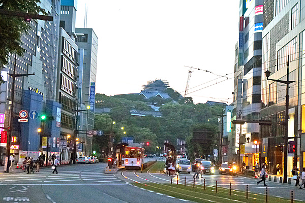 夕闇せまる熊本市に到着。早速、相棒を宿で休んでてもらって熊本城を訪れてみる。案の定、城内には立ち入れない。遠く復旧工事が進んでいる天守閣を眺める。