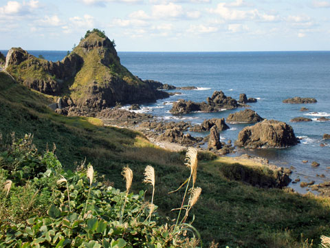 写真:(左上)恋路海岸 (右上)見附島(軍艦島)