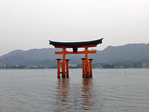 宮島口から連絡船で10分程で日本三景の宮島に到着。早速、鹿くんのお出迎えをうける。世界遺産に登録されている厳島神社に見とれているうちに海面は満潮時になり、朱塗りの大鳥居と社殿は海に浮かぶ。