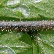 ![]() 胞子嚢群は中肋寄りにつき、包膜は三日月形、鉤形、馬蹄形が混ざる |