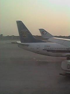 右の写真はちょっと見づらいのですが、北京空港に駐機中の南方航空のBoeing767の後部をを東方航空の機内から撮ったものです。