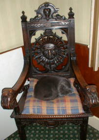 ホテルの椅子の上でも、猫はまだ夢の中。