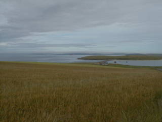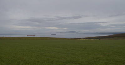 牧草地の向こうに隣の島へ続くコーズウェイとチャーチルバリアーの沈められた船