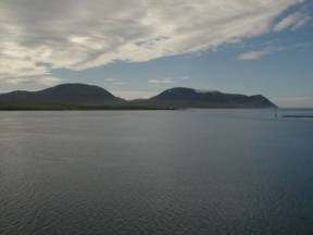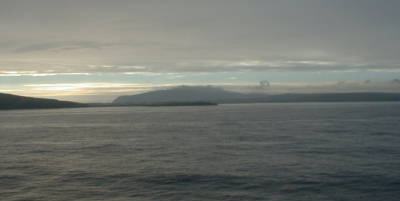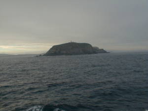静かなキャビンで、うとうとしていると、シェトランドの南端のサンバー岬のアナウンス。さっそくデッキに出ると、岬は見えるがその後ろの山には雲が山を駆け下りるのでは、という勢いでかかっている。怖さと威厳さを感じた。