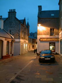 しかし、宿を確定したからには街へ。ホテルは中心部から少し離れているので車で向かう。桟橋前の大きな駐車場に車を停める。街の中心はオークニーのカークウォールと同じように細く曲がった石畳。なかなかのショッピング街だが、当然すべて閉まっている。島の夜は早い。