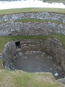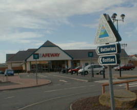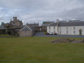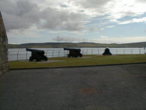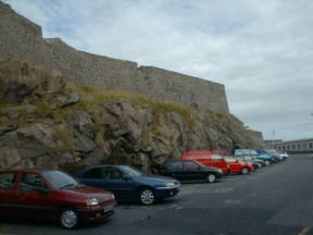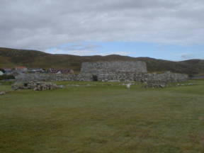 途中にも地図上には遺跡があるようだったが、どこも道路上には表示はないため、車を進める。ラーウィックの街に入りかけたとき、左手に大きな遺跡が目に入る。近くには駐車場がなかったが、大きなスーパーのセーフウェイがあったので、取り敢えず停めさせて頂く。