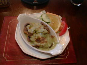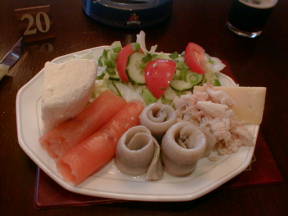 左はスコットランド名物のハギスにチーズをかけたもの。大変な美味だった。右はメインの海の幸とチーズのプラッター。
