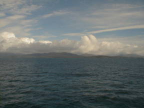 ユイグの岬を後にする。まだ朝なので、西へ向かう船からは太陽の光に輝く海の先にスカイ島が見える。