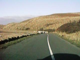 途中の道すがら、羊に道をふさがれてしまいました。(前方の白いのが羊の群れです)
