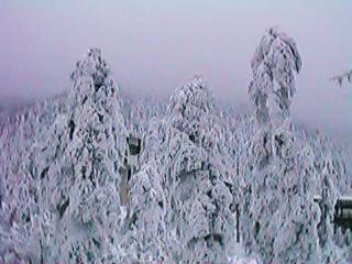 バスとロープウェイを乗り継いで、約5時間掛けて金頂と呼ばれる山頂の一つにたどり着きました。その近くの風景です。蔵王ではありません。ふもとには雪など全くないのに、上の方はこうです。