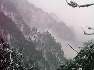 ここは標高2千メートル付近にある洗象池と呼ばれるお寺です。雪も降っていますが、霧もかなり濃く、霧の中に浮かぶ寺の建物は霊山の名にふさわしい光景でした。