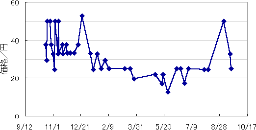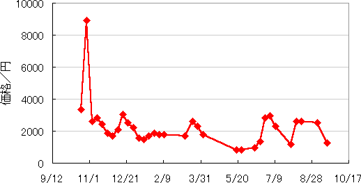 卸売価格(5kgあたり) 値崩れしてるよ(・w・)! このグラフはあとむちゃんが作ってくれました。ありがとう(・w・)!