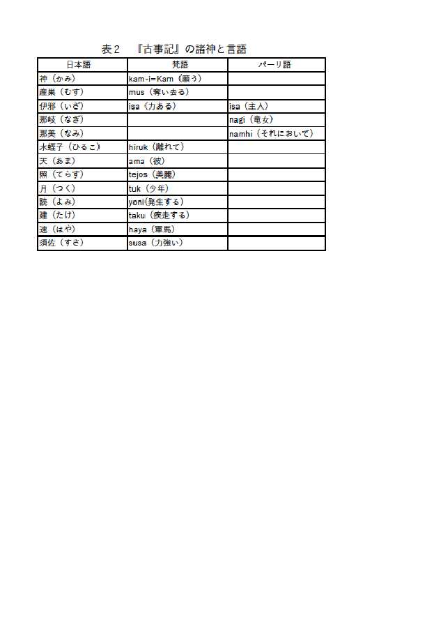 『古事記』には数々の神が登場する。表2で示す如く, 「神」については梵語でkam-i=Kam(願う)意である。現代の我々が神前で祈り, 願う対照としての意に合致している。