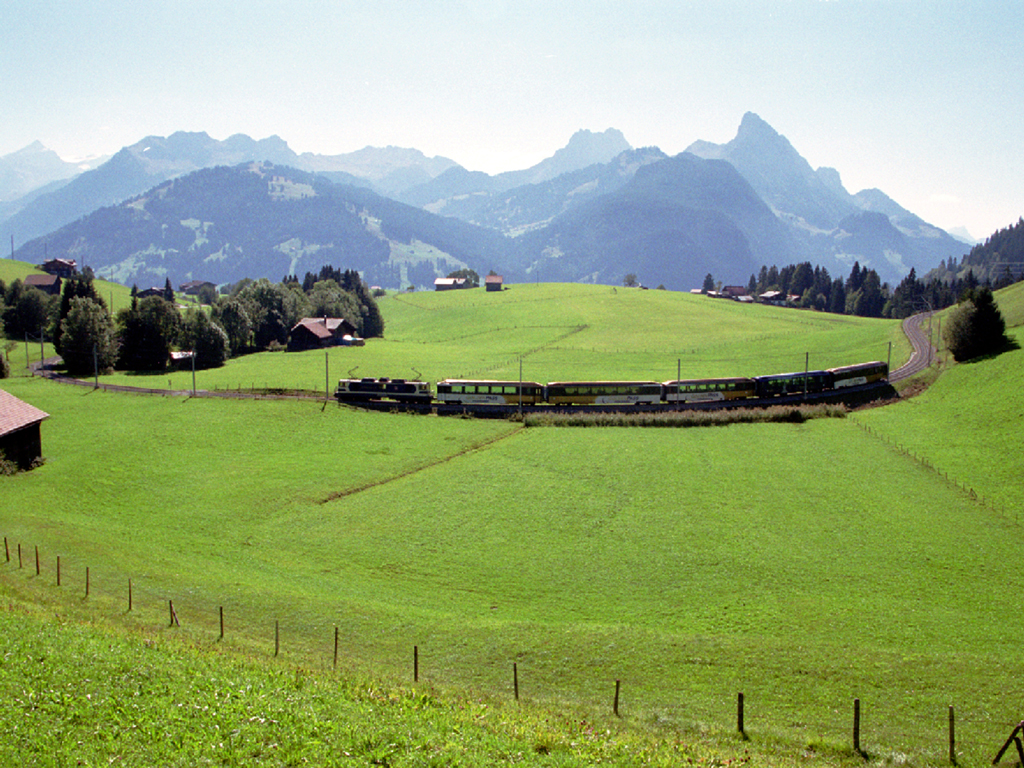 レマン湖畔の街モントルーから前編でたどり着いたツバイジンメン間を主とする鉄道。列車としては、「ゴールデンパス・パノラミック・エクスプレス号」が観光用の列車として運行され、列車によっては先頭展望が可能な(小田急ロマンスカー、名鉄パノラマカーのような)パノラミック車両(1等車要予約、追加料)が連結されている。軌間は1000m。 |