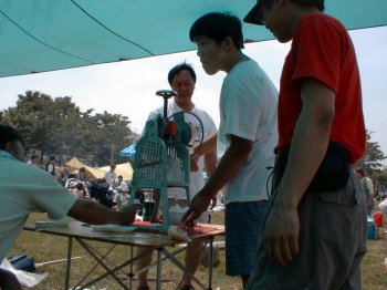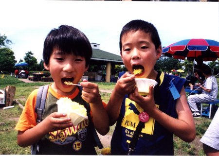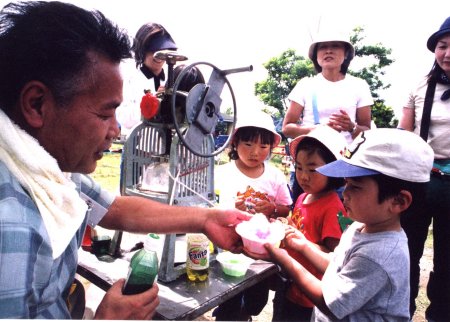 当日は梅雨入りにもかかわらず快晴のとても暑い日でした。持って行ったかき氷機も大変好評でしたが、自転車でアイスキャンディーを売りに来たおじさんに恨めしそうに話しかけられたりしました。(商売のじゃまをするつもりはなかったのですが・・・)