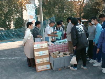 作業所の手作り品の前に群がる生徒達