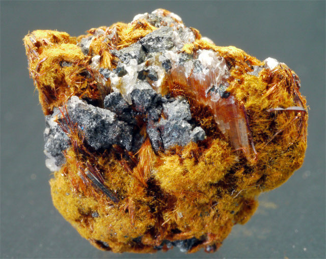 A specimen with rich coverage of Ludlockite and a bit of transparent Leiteite crystals.