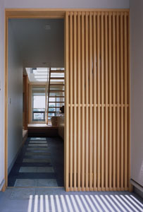 | 南北に細長い敷地で、かつ、北側方向に傾斜地となっており、展望が開けている市川市の郊外に建つ住まいである。60才代の御夫婦と、息子一人が住まわれる家です。南北に抜けがあり、スケールが感じられる。また、自然素材を多用し、光と風がよく通る健康住宅である。 |