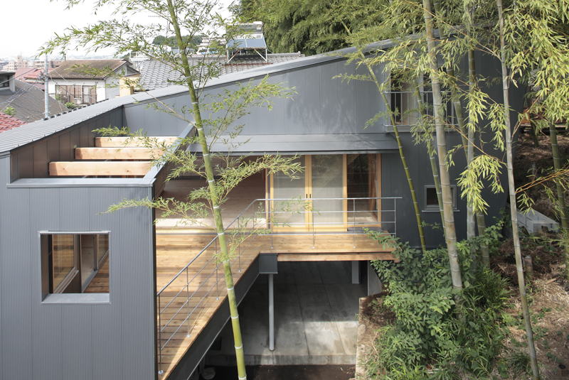 | 2方を斜面地に囲まれ、日照や通風にとって大変厳しい環境に建つこの家は、30代の夫婦と2人の子供のための住まいです。斜面地を逆手にとって各部屋から竹林を眺められるように計画され、かつ、光と風が各部分に行き渡るよう意図されている。目の行き届く子育て住宅でもある。 |