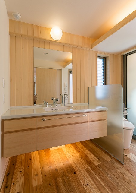 壁は天然木ヒバ。洗面室と浴室は一体の空間と考え、壁材を統一しています。