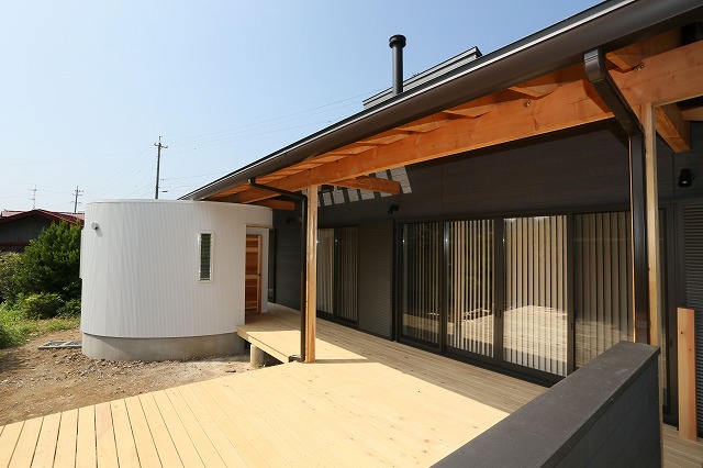 母屋から庇のかかったデッキを通って出入りします。