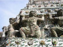 陶器のかけらを漆喰に埋め込んでます。 可愛い花柄とか。 仏塔の段の途中には、天使や鬼神が塔を支えています。 ここに来ると同じポーズをして写真撮りたくなるんですよねー(笑)。 写真左は天使。右は何だろう?半人半獣。 以前は塔のかなり上まで登れたそうですが、今は基壇くらいまでしか登れません。 |
