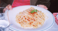 今日はアルノ川を渡ったところで食べようということになり近くのサンタ・トリニタ橋を渡りお土産物やさんを覗いたりしていたら、どこの食事処もオープンする19時になったので『CELESTINO』というリストランテに入った。トスカーナ風の生ハムとトマトソースのパスタ(右)とチキンにマッシュルームのクリームがかかったものと赤ワインを頼んで2人でシェアをした。ちゃんとしたリストランテなので頼み方がすごい難しい。オープンテラスで食べたので気持ちが良く、20時を過ぎたあたりからお店も満席になってきた。真後ろにあるピンク色のリストランテもとても賑わっていて気になった。ドルチェにティラミスとチョコレートアイスを頼み、カプ・チーノで締めくくった。お会計は96,000リラ/2人(約5,760円)。雰囲気も良くとてもおいしい夕食だった。帰りはポンテ・ヴェッキオを渡りアルノ川沿いを歩いてホテルまで帰った。リストランテからホテルまでは40分くらいの道のりでホテルに着いたら21時半をまわっていた。明日はピサだ! |