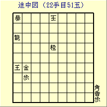 42角は、41玉、91龍、52玉、51龍、43玉、49香に46歩の中合で逃れ。 左から62角は、61玉、91龍、72玉、71龍、63玉、73龍、54玉、59香に、これも57歩と中合で逃れ。 52歩は41玉、23角、32香合で逃れ。 95角という93龍のピンをはずす妙手もある。 84桂でも際どいが、84歩合、53龍、52角合の逆王手で逃れ。 33角、61玉で69香に誘われる。これも64歩の中合で逃れ。 82歩が打てれば詰むが「二歩はダメですよ」 31手目33馬で43馬は、31玉、39香に33歩の中合で逃れ。 33馬に41玉で途中図。 最大の難所。 |