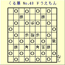 ドうえもんさん、1月のくる展No.46に続き、きれいな龍追い作品で登場。 2枚の角と4枚の銀が龍の支えとして、盤面中に目を光らせています。 角銀の斜めの利きを表示すると(左図)、龍追いのレールが引かれているのが分かるでしょう。 でも、このレール、遊園地のティーカップみたいで、ぐるっと回って無限軌道。 くるくるっと、いつまでも楽しめます。 しばらく楽しんだら? どうしたら詰められるのか、そろそろ考えて見ましょう。 まずは36龍からスタート! 36龍、48玉、38龍、57玉、58龍、 ここで左右対称になりました。 右派の人は46玉へ、左派の人は66玉へ。 どちらでも同じなので、とりあえず右に行ってみましょう。 46玉、56龍、37玉、 56龍には35玉の方が広そうですが、26龍、34玉、25角、という手があってすぐに詰んでしまいます。 37玉に36龍は無限軌道。 目を回さないうちになんとかしないと・・・ そう、龍の位置が56に変っているので、初手では成立しなかった38銀という味の良い手があるのです。 38銀、28玉、26龍、39玉、29龍、48玉、49龍、57玉、58龍、 また右へ行くか左に行くか迷うところですが、87銀が残っている状態で上に行くと、75玉のときさっきと同様86龍から85角があるので、右側と同じように銀を移動させます。 66玉、56龍、77玉、78銀、88玉、86龍、79玉、89龍、78玉、79龍、57玉、58龍、 また左右対称になりました。 右派の人は46玉へ、左派の人は66玉へ。 ここではとりあえずさっきと同じく右に。 46玉、56龍、35玉、36龍、24玉、25龍、33玉、23龍、42玉、43龍、51玉、41龍、 62玉、61龍、73玉、63龍、84玉、83龍、75玉、85龍、66玉、76龍、57玉、56龍、 三度左右対称になりました。 一見元に戻ってしまったようですが、龍の位置は56です。 ここまでくれば、48玉でも68玉でも簡単。 最後は左に行ってみましょう。 68玉、58龍、79玉、69龍、88玉、89龍、97玉、87龍 まで61手 とても対称性の高い龍追いで、お楽しみいただけたと思います。 3回の対称形に解説では右、右、左と逃げましたが、解答は右右右から左左左まで千差万別。 右利きの人が多いせいか、一番多いのは右右右でした。 完成品でこれ以上、手を入れる余地はないかと思いましたが、詰工房で某大作家に見ていただいたら、 「上の銀も動かせると、上下の手順の対応がでて、もっとよくなる」 とのコメント。 流石に目の付け所が違いますね。 それでは、みなさんの感想を。 解答到着順です。