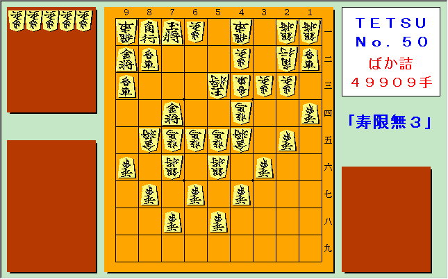 TETSU No.50 は、50回記念として、約50,000手という超長編ばか詰を出題します。 先手後手協力して、最短手順で後手玉を詰めてください。 「寿限無」 の改良図。 「寿限無」 をご存じの方には難しくないと思います。 初めての方はじっくりお楽しみください。