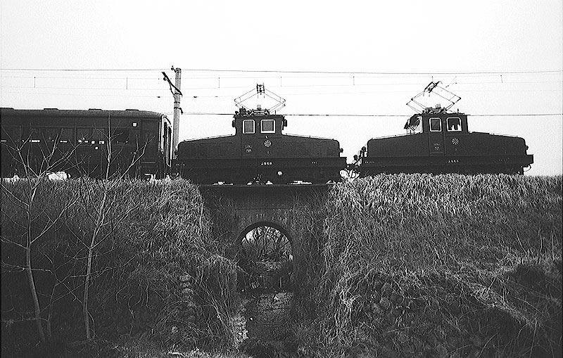 小窓旧客”スハフ32”を従え、レンガ造りのアーチ橋を渡る。