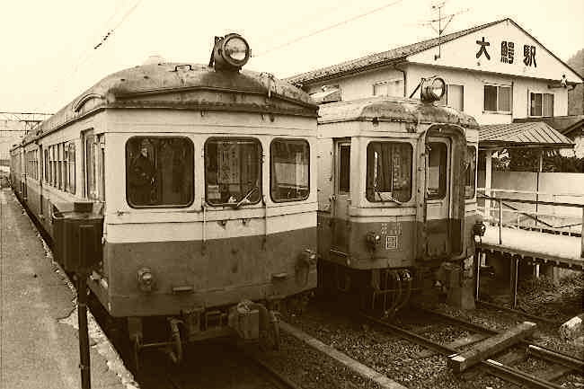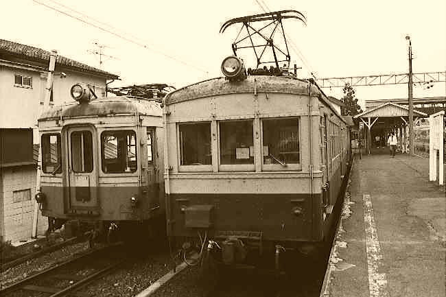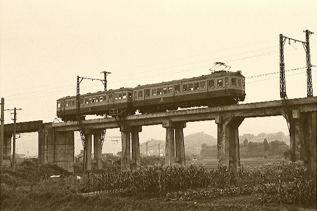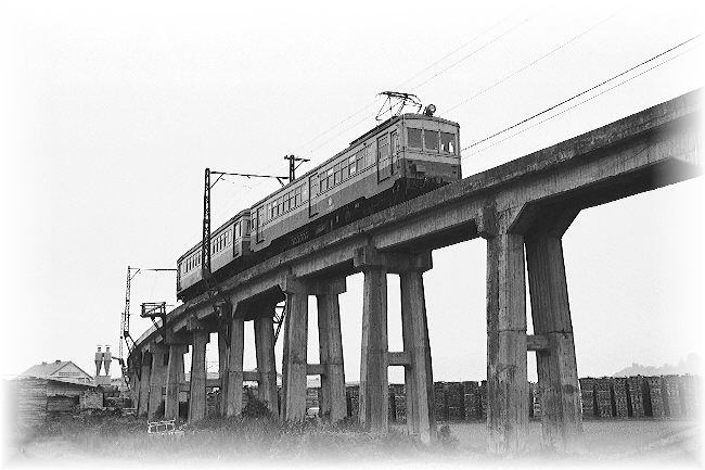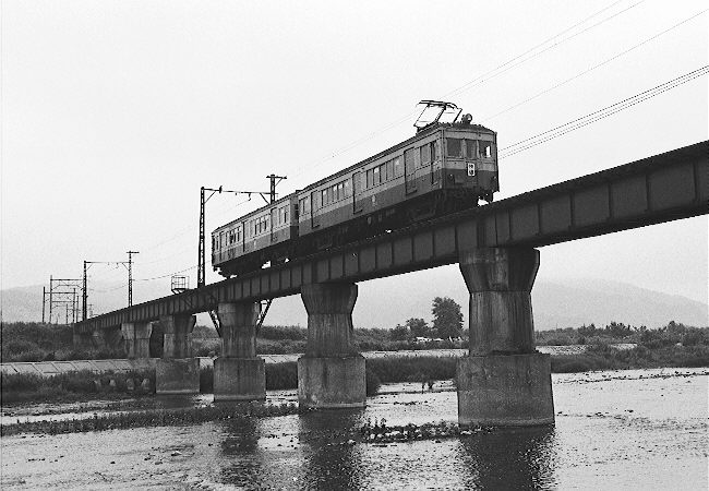 大鰐駅で出発を待つ古豪。JRは「大鰐温泉駅」と改称しましたが、弘南鉄道はそのままの「大鰐駅」です。 奥羽本線をクロスする、コンクリート橋の石川陸橋。橋脚が独特な形状をしています。(石川-義塾高校前) 平川橋梁を渡る、快速電車。白地に赤文字の札を付けて走りました。(鯖石-石川)
