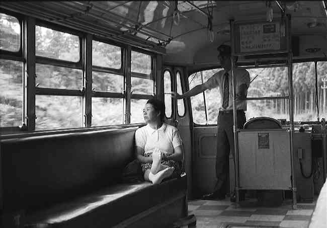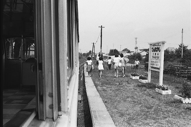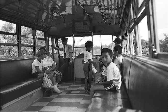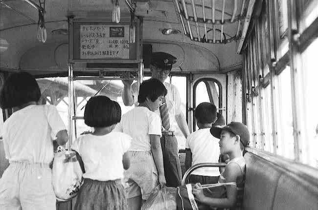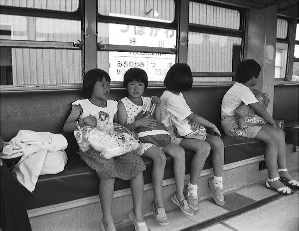 レールバスの座席に、ちょこんと座る少女達。プールの帰り道かな?