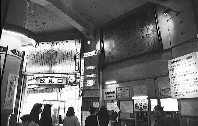 昼なお薄暗い駅舎内。手書きの路線案内図が、いい味だしてました。