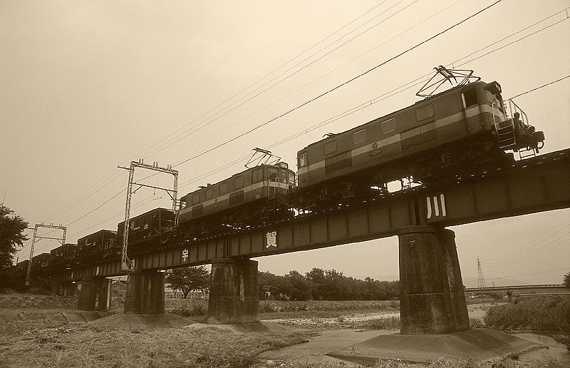宇賀川橋梁を渡る、中部国際空港の埋立用土砂輸送列車。茶ガマEDの重連は大迫力! 大安-三里
