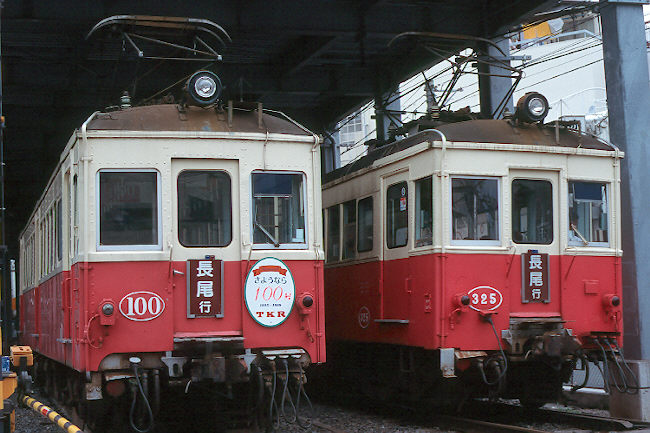 さよなら運転を前に、瓦町で待機する100号の脇を、僚車325号が駆けぬける。