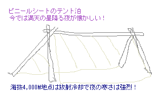 このテントはすごかった。潅木にビニールシートをかけただけという粗末なテントだった。