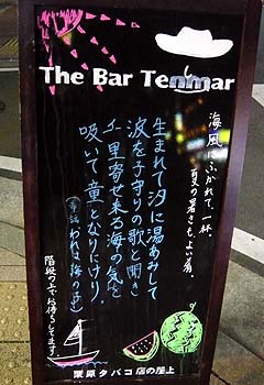 ちなみに、その看板の5か月間のコレクションを紹介すると。 *5月 「祝Y154周年。 *6月 「さみだれのそそぐ山田に早乙女が *7月 「生まれて汐に湯あみして 波を子守の歌と聞き *8月 「酷暑に耐えた、ご褒美は・・・ *9月 「いづれは消える 夢だから 気が付いたと思うけど、童謡・唱歌を転載しているようだ。 オーナーは天満さんという方で、もと高校教師(担当は国語らしい)。しかも ここバーテンマーは小さなタバコ屋のビルの屋上にあって、屋根はない。 行った時はすずしい日だったので、ビル風が通って気持ちよく、上を見上げると なぜ屋根が無いかというと、建築基準法の都合でビルの上に屋根のある建物は このお店、基本は“年中無休”らしいけど、雨天、極寒、強風は休業というユニー 入口はこちら、 明るく気さくで、その日の天気によって営業が決まる。 ドリンクもおつまみも500円。隠れ家Barを探してる貴兄にオススメです。 「The Bar Tenmar」(ザ・バー・テンマー) |