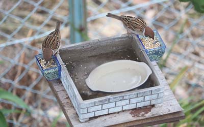 ちょうど1年前、鳥たちの水浴び場を 作ってあげたけど、そんなに使われ なくて寂しい状態だった。 そこで、器の両サイドにエサ箱をつけた ら来るんじゃないかとGWに工作した。 ![]() エサ箱に雨水が溜まらないように底に 穴をあけて、穴からエサがこぼれない ように網戸の網を針金で括り付けた。 ![]() これが大成功! 連日、スズメが来て食べている。 ![]() 一度に3匹も4匹もエサ台に乗り、 中にはケンカするやつも出てきた。 水浴び用に100均で買ったグラタンの 器を置いた。エサを食べるついでに 水を飲んでくれている。 関連記事 5/2(水)『鳥の水浴び台』 |