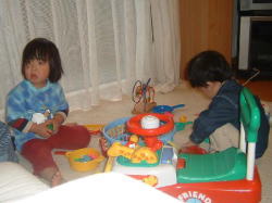 | 今日はお休み!我が家にKaoちゃんとKouくんが遊びに来ました。 Kouくんはちひろと同じ学年とはいえ、2才になったばかり。 普通このくらいだとわがまま三昧だったりするけれど、Kouくんはすごく聞き分けがよくて、ほぼ初対面の私にも、夫にも人見知りせず、びっくりでした。 印象的だったのは、我が家のビデオコレクションの中から真っ先に「おかあさんといっしょ歌のビデオ」を取り出したこと。「りょーこおねえちゃん、みる」と訴えた姿は忘れられません。Kouくんの初恋の人になるのかしら・・・? ちひろは、やはりKouくんを年下だと認識しているようで、歩くときも手をつないであげたり、おもちゃの取り合いになっても、一歩譲る姿がみられました。 つくづく思うのは、ちひろが一番安定して遊んでいるのは、「年下の男の子」が相手の時ではないかということ。 お姉さんぶりを発揮して、あれこれ世話を焼いている姿は本当に楽しそう。将来が楽しみである(笑)。 天気がよければ、公園でお弁当食べてとあれこれ考えていたんだけど、残念ながら雨でした。 今度遊ぶときは期待してるよ!雪男Kouくん!! ![]() *仲良く?遊んでいる姿* |