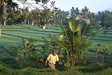 朝露のついた稲なんぞを見て得した気分になり宿に戻った。 ![]() テラスで朝食を取りながら今日一日の行動を考えた。 ![]() ![]() ![]() ボーイには夜のレゴンダンスのチケットの手配を頼むと、「タクシーとかツアーとかは要らないか」と聞いてきた。 ![]() いや今日は「ジャラン ジャラン(散歩)」だから要らないと断った。