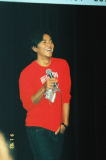 そして三度イーキン。 今度は抽選会。座席番号の入った箱をイーキンがひいて、あたった人はプレゼントとイーキンとの2ショットポラがもらえる、というもの。 それでは…とひきはじめ、次々読み上げていくイーキン。あっというまに4人分ひいちゃって司会の人に「一人ずつお願いします!」と止められる。 |